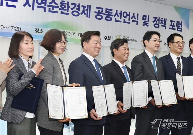 사례 발표에 앞서 김경수 지방시대위원장, 5개 지자체장(광명시, 부여군, 영암군, 대전 중구, 울산 동구) 등이 함께 ‘지역을 살리는 지역순환경제 추진을 위한 공동선언문’을 발표했다.