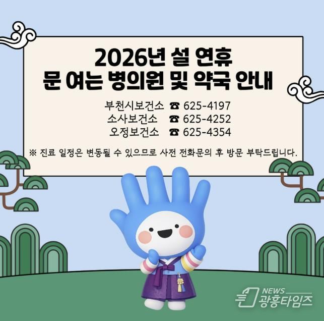 송정원 부천시보건소장은 “시민들이 안심하고 건강한 설 연휴를 보낼 수 있도록 의료 공백이 발생하지 않게 현장 대응과 관리에 힘쓰겠다”며 “응급 상황에도 신속히 대응할 수 있도록 관련 기관과의 협력을 이어가겠다”고 말했다.