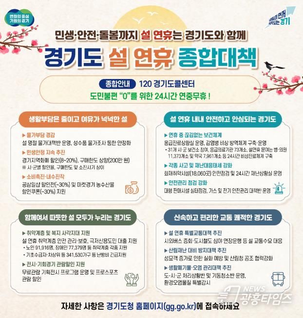 [광흥타임즈 = 조수제 기자] 경기도가 도민들이 따뜻하고 편안한 명절을 보낼 수 있도록 ‘설 연휴 종합대책’을 추진한다.