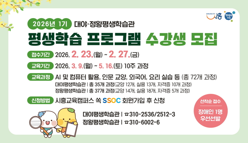 [광흥타임즈 = 조수제 기자] 시흥시 대야ㆍ정왕평생학습관은 오는 2월 23일부터 27일까지 ‘2026년 1기 평생학습 프로그램’ 수강생을 모집한다. 이번 1기 프로그램은 3월 9일부터 5월 16일까지 10주간 운영된다.
