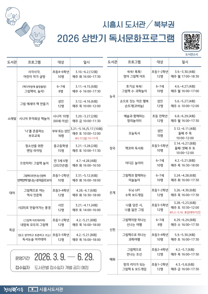 이 밖에도 도서관별 특화 주제를 살린 특색 있는 프로그램이 시민의 독서와 문화 체험 기회를 확대할 예정이다. 프로그램 세부 내용은 각 도서관 홍보물과 시흥시도서관 누리집에서 확인할 수 있다.