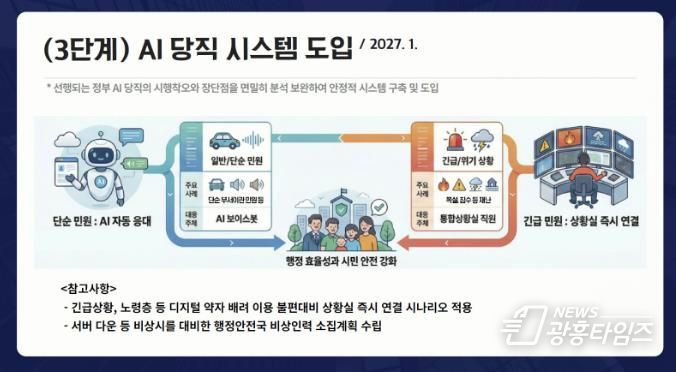 내년 1월부터는 3단계 ‘AI 당직 시스템’을 본격 가동한다. 야간시간 처리가 불가능한 단순 부서 이관 민원 등은 AI 보이스봇이 24시간 자동 접수하고, 긴급 상황·복합 민원은 즉시 통합상황실로 자동 연동되는 AI-인간(Human) 협업 방식이다. 노령층 등 디지털 약자를 위한 즉시 연결 서비스와 장애 대비 비상 인력 체계도 마련한다.