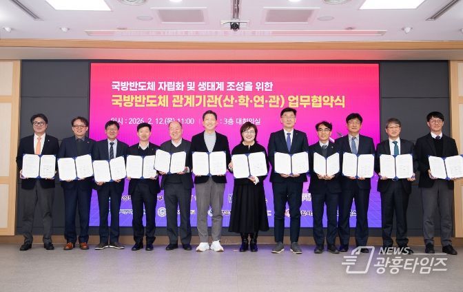 [광흥타임즈 = 조수제 기자] 경상북도는 2월 12일 구미시청에서 양금희 경제부지사, 김장호 구미시장이 참석한 가운데 한국과학기술연구원(KIST), 서울대학교 반도체공동연구소를 비롯한 노융합기술원(NINT), 대구경북과학기술연구원(DGIST), 구미전자정보기술원, 국립금오공과대학교, 경운대학교 등 국방·반도체 분야 주요 연구기관・대학, ㈜KEC, 한화시스템, LIG넥스원 등 산업계 대표 기업이 참여한 ‘국방반도체 자립화 및 생태계 조성을 위한 업무협약(MOU)’을 체결했다고 밝혔다.