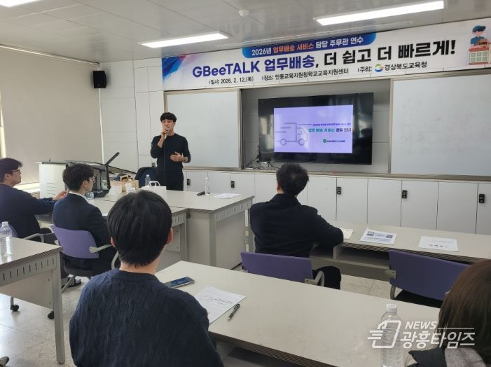 [광흥타임즈 = 조수제 기자] 경북교육청은 12일 안동시에 있는 안동교육지원청 학교교육지원센터 대회의실에서 도내 학교지원센터 담당 장학사, 업무 배송 주무관, 업무 배송 팀장 등 약 80명을 대상으로‘2026 모두를 위한 업무 배송 서비스 운영자 연수’를 개최했다고 밝혔다.