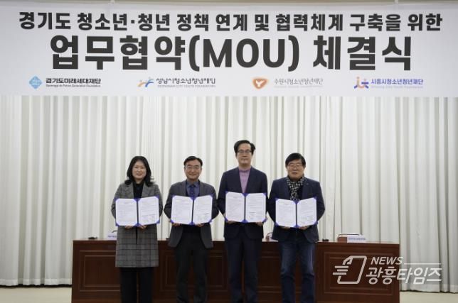 [광흥타임즈 = 조수제 기자] (재)시흥시청소년청년재단은 지난 2월 12일 경기도청 옛청사 신관 4층 대회의실에서 경기도미래세대재단, 수원시청소년청년재단, 성남시청소년청년재단과 함께 ‘청소년ㆍ청년 정책 연계 및 협력체계 구축’을 위한 업무협약을 체결했다.