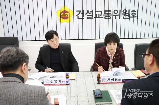 [광흥타임즈 = 조수제 기자] 경기도의회 건설교통위원회 서성란 의원(국민의힘·의왕2)과 교육행정위원회 김영기 의원(국민의힘·의왕1)은 13일 경기도의회 건설교통위원회 회의실에서 경기도 및 의왕시 관계 부서와 함께 의왕시 도시재생사업 추진 현황을 점검하고 대응 방안을 논의하기 위한 정담회를 개최했다.