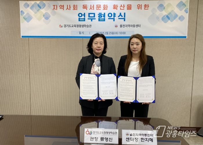 [광흥타임즈 = 조수제 기자] 경기도교육청평생학습관이 25일 지역사회 어린이들의 독서문화 확산과 다양한 독서프로그램 개발을 위해 율전지역아동센터(센터장 한지혜)와 업무협약을 체결했다.
