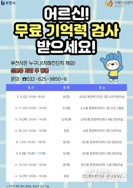 [광흥타임즈 = 조수제 기자] 부천시는 치매 조기 발견과 중증화 예방을 위해 3월 6일부터 4월 16일까지 ‘2026년 상반기 찾아가는 치매조기검진(동별검진)’을 실시한다.