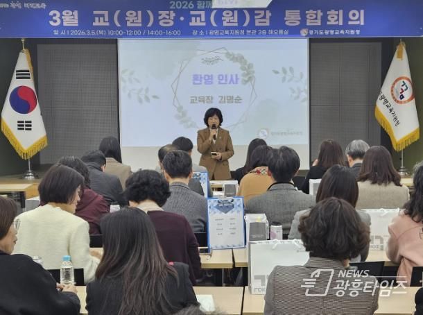 [광흥타임즈 = 조수제 기자] 경기도광명교육지원청은 3월 5일, 광명교육지원청 3층 해오름실에서 2026 해오름 광명교육과 경기미래교육 구현을 위한 ‘2026년 3월 교(원)장, 교(원)감 통합회의’를 운영했다. 이번 통합회의는 학년 초 학교와 교육지원청, 도교육청 간의 협력을 강화하고, 학교 중심의 교육정책, 미래장학, 교육과정운영의 선순환 체제를 통해 학교 중심 행정 지원의 기틀을 마련하고자 진행됐다.