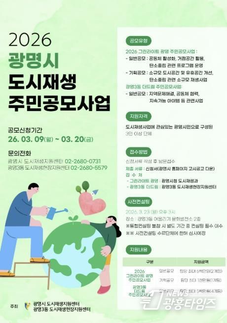 [광흥타임즈 = 조수제 기자] 광명시가 오는 20일까지 주민이 스스로 마을 문제를 해결하고 공동체 활성화를 이끌어갈 ‘2026년 도시재생 주민공모사업’ 참여단체를 모집한다.