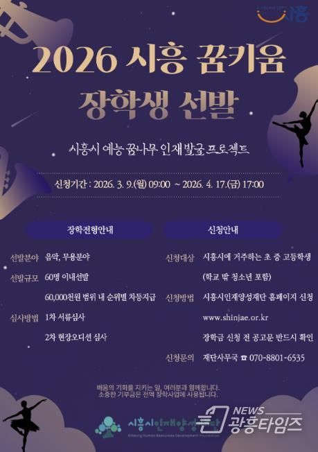 [광흥타임즈 = 조수제 기자] 시흥시인재양성재단은 지역 내 예능 분야 인재를 발굴ㆍ육성하기 위해 ‘2026년 시흥 꿈키움 장학생’을 60명 이내로 선발한다.