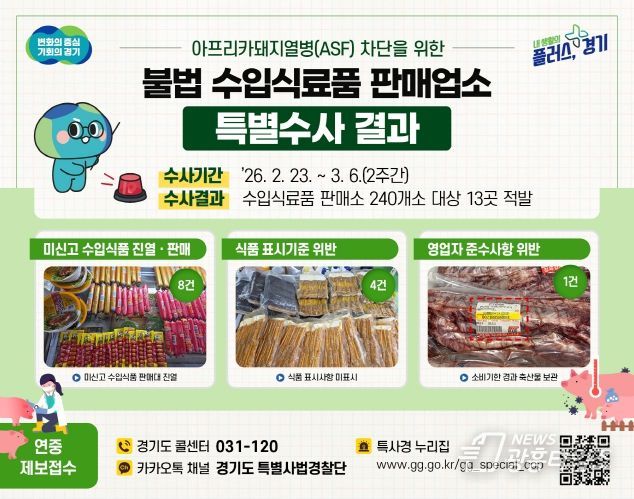 [광흥타임즈 = 조수제 기자] 경기도 특별사법경찰단은 아프리카돼지열병(ASF)의 국내 유입·확산 방지를 위해 수입식료품 판매업소를 수사한 결과, 미신고 수입식품 판매 등 총 13건을 적발했다고 11일 밝혔다.