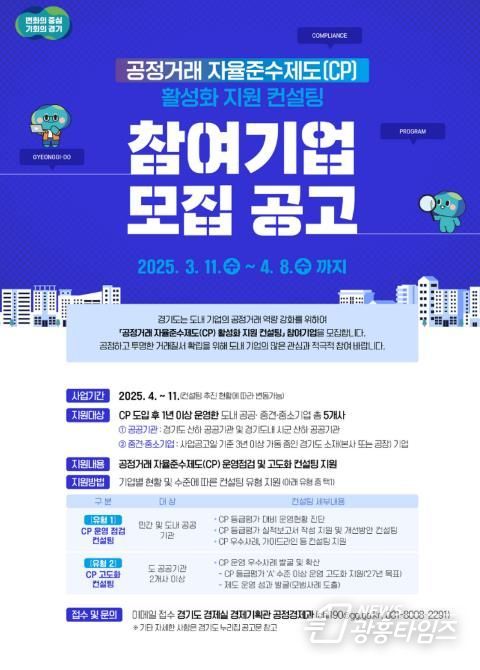 [광흥타임즈 = 조수제 기자] 경기도가 기업의 공정거래 자율준수 문화 확산과 경영 애로 해소 지원을 위해 ‘공정거래 자율준수제도(CP, Compliance Program) 활성화 지원 컨설팅’을 추진한다.