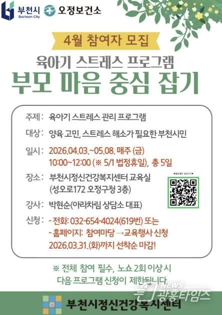 송정원 부천시보건소장은 “양육 과정에서 부모들이 겪는 스트레스와 감정을 건강하게 돌보는 것이 중요하다”며 “이번 프로그램이 부모들이 서로 공감하고 마음의 균형을 찾는 시간이 되길 바란다”고 말했다.