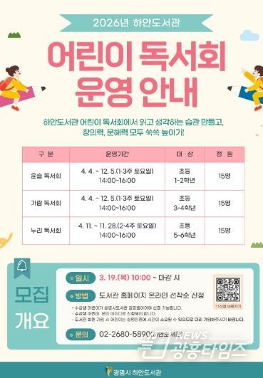 [광흥타임즈 = 조수제 기자] 광명시 하안도서관은 어린이들이 올바른 독서 습관을 형성하고 기초 문해력을 기를 수 있도록 ‘2026년 어린이 독서회’ 참여 회원을 모집한다.