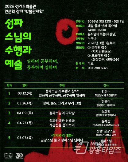 또한, 경기도박물관은 본 전시와 연계해 ‘성파스님의 수행과 예술-일하며 공부하며, 공부하며 일하며’를 주제로 인문학강좌(5회)를 마련했다. 3월 26일에는 ‘성파, 통도 그리고 우리 그림’이라는 주제로 정종미 한국화가가 미술재료를 탐구하는 강의를 진행한다. 자세한 내용은 경기도박물관 누리집(musenet.ggcf.kr) 참고.