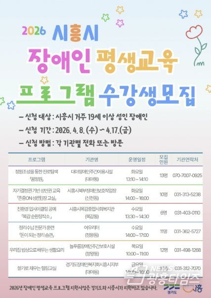 [광흥타임즈 = 조수제 기자] 시흥시가 관내 성인 장애인의 학습권 보장과 사회참여 확대를 위해 ‘2026년 장애인 평생교육 프로그램 지원사업’을 본격적으로 시작하며, 4월 8일부터 17일까지 프로그램 운영을 위한 학습자를 모집한다.