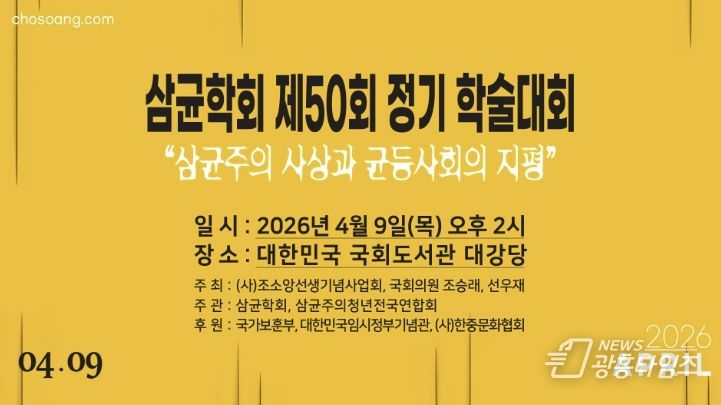 [광흥타임즈 = 조수제 기자] 2026년 병오년(丙午年)을 맞아 '삼균학회 제50회 정기학술대회'가 국회도서관 대강당에서 개최된다. 이번 학술대회는 (사)조소앙선생기념사업회, 조승래 국회의원실, (사)선우재가 공동 주최하고, 삼균학회와 삼균주의청년연합회가 주관하며, 국가보훈부, 국립대한민국임시정부기념관, (사)한중문화협회가 후원한다.