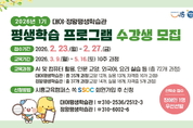 [광흥타임즈 = 조수제 기자] 시흥시 대야ㆍ정왕평생학습관은 오는 2월 23일부터 27일까지 ‘2026년 1기 평생학습 프로그램’ 수강생을 모집한다. 이번 1기 프로그램은 3월 9일부터 5월 16일까지 10주간 운영된다. 이번 과정은 시민의 다양한 학습 수요와 최신 교육 흐름을 반영해 인문·교양부터 자격증 취득, 실생활 활용 중심의 실용 과정까지 폭넓게 구성됐다. 특히 시흥시가 지향하는 첨단 미래 혁신도시 비전에 맞춰 디지털 및 인공지능(AI) 분야 강좌를 대폭 강화한 것이 특징이다. 주요 강좌로는 ▲생성형 인공지능(AI)과 함께하는 디지털 콘텐츠 제작 ▲챗지피티 활용 과정 ▲인공지능(AI) 전문가 자격증 과정 ▲디지털 드로잉 아티스트 과정 등이 마련돼, 시민들이 급변하는 인공지능(AI) 기반 사회에 필요한 미래 역량을 체계적으로 기를 수 있도록 지원한다. 아울러 시는 누구나 차별 없이 학습할 수 있는 환경 조성을 위해 전 강좌에 ‘장애인 1명 우선 선발제’를 도입했다. 이를 통해 장애·비장애인이 함께하는 통합 학습 환경을 조성하고, 평생학습의 접근성을 한층 강화할 방침이다. 이번 1기 프로그램은 대야평생학습관에서 교양ㆍ실용ㆍ자격증 등 총 35개 강좌를, 정왕