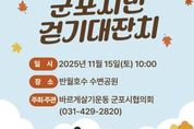 [광흥타임즈 = 조수제 기자] 군포시와 바르게살기운동 군포시협의회는 오는 11월 15일 오전 10시, 군포시의 대표 명소인 반월호수 수변공원 일원에서 가을맞이 ‘2025년 군포시민 걷기대잔치’ 행사를 개최한다. 걷기대잔치는 매년 군포시의 가을을 만끽할 수 있는 장소에서 시민들이 함께 걸으며 건강 증진과 지역공동체 화합의 장으로서 인정받고 있으며 작년에 이어 올해도 반월호수 수변공원 개최된다. 걷기 코스는 반월호수를 크게 한 바퀴 도는 코스로 약 60분 가량 소요되며 반월호수공원을 출발해 쌈지공원, 대야물말끔터를 지나 다시 출발지로 돌아오면 된다. 종료 후에는 주관단체에서 중식(국수)를 제공할 예정으로 시민들이 걷고 먹고 즐기는 화합의 장이 될 전망이다. 이번 행사는 사전접수 없이 누구나 당일 참석이 가능하지만 주차 공간이 협소하여 혼잡이 예상되므로 가급적 대중교통을 이용하면 좋다. 대중교통 이용 시 지하철 4호선 대야미역에서 내려 마을버스 ‘1-1’, ‘1-2’, ‘6-1’번을 탑승해 ‘둔터-반월호수’ 정류장에서 하차하면 된다. 하은호 군포시장은 “반월호수 둘레길은 수리산의 아늑함과 호수 위를 걸