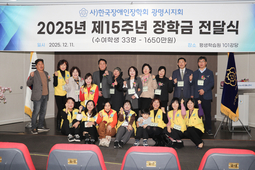 [광흥타임즈 = 조수제 기자] 지난 11일, 오후3시 사단법인 한국장애인장학회 광명시지회(회장 윤여준)는 광명시 평생학습원에서‘제15주년 장학금 전달식’을 열고 광명 지역 장애 학생 33명에게 총 1,650만 원의 장학금을 수여했다. 또한 크로바가방(대표 나준식)은 장학생 33명 전원에게 여행용 가방을 후원·전달했다. 작은 도움들이 모여 한 사람의 미래를 밝히는 순간, 15년 동안 쉼 없이 이어져 온 장학회의 발걸음이 이날 한층 더 빛났다. 이번 장학생들은 관내 학교장과 장학위원회, 광명시 장애인복지과의 추천을 통해 선발됐으며, 이는 지역사회가 한 마음으로 학생들의 가능성과 성장을 지켜보고 있음을 보여준다. 이날 행사는 김도민 사무국장의 사회로 진행됐으며, 임명장 수여 및 임원소개, 개회선언, 국민의례, 내빈소개, 기념사, 격려사, 축사, 장학금 전달 순으로 진행됐다. 또한 행사에는 안성환 광명시의회 의원, 심상록 임오경 의원실 보좌관, 서연희 2대 회장, 강경남 4대 회장, 박순희·이희숙·길하영·김양중·김양례·변동수·문선경·최정균·김영애 부회장과 주명선 봉사단장, 수상자, 수상자 가족들과 자원봉사자들이 참석해 장학회의 15년 활동을 기념했다. 윤여준 회장은