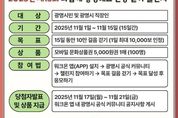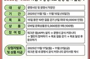 [광흥타임즈 = 조수제 기자] 광명시는 시민들의 건강한 생활습관 형성과 걷기 문화 확산을 위해 ‘제13회 다함께 광명해요 건강 걷기 챌린지’를 진행한다. 이번 챌린지는 오는 11월 1일부터 15일까지 15일간 열리며, 광명시민과 광명시에 소재한 직장인이면 누구나 참여할 수 있다. 참가자는 기간 동안 총 10만 보를 걸으면 되며, 1일 최대 1만 보까지만 인정된다. 참여 방법은 간단하다. 10월 29일부터 워크온(WalkOn) 앱을 설치하고 광명시 공식 커뮤니티에 가입한 뒤 ‘제13회 건강 걷기 챌린지 참여하기’를 눌러 걷기를 시작하면 된다. 단, 목표 걸음을 달성한 시민은 ‘응모하기’ 버튼을 눌러 참여를 완료하면 된다. 누적 걸음 수 목표를 달성한 참여자 중 추첨으로 100명에게 모바일 문화상품권 5천 원권 1매를 지급한다. 당첨자 발표와 상품 지급은 11월 17일부터 11월 21일까지 진행할 예정이다. 나기효 건강위생과장은 “매회 많은 시민이 참여하는 ‘다함께 광명해요 건강 걷기 챌린지’는 일상 속 건강한 습관을 형성할 좋은 기회다”며 “시민들이 걷기를 통해 건강도 챙기고, 작은 선