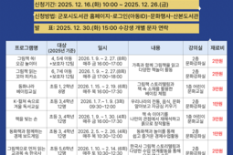 [광흥타임즈 = 조수제 기자] 산본도서관은 겨울방학을 맞아 유아 및 초등학생 대상 겨울방학 독서진흥 프로그램 및 독서교실을 오는 1월 7일부터 2월 27일까지 운영한다. 이번 행사는 총 7개 프로그램으로 구성되며, 어린이들이 도서관을 통해 책과 친해지고, 다양한 체험을 즐길 수 있도록 기획됐다. 겨울독서교실은 관내 초등학교 3~4학년 어린이 12명을 대상 ‘K-컬쳐’를 주제로 전통놀이, 한국의 멋, K-푸드, 한류 등과 관련해 책을 읽고 창의적인 활동에 참여함으로써 독서의 즐거움을 발견하고 한국 문화를 깊이 이해하는 시간을 제공한다. 또한, 독서와 미술·경제·역사 분야를 접목한 겨울방학 프로그램을 통해 어린이들이 흥미롭게 지식을 확장할 수 있는 기회를 제공한다. 주요 프로그램은 ▲그림책 쏙! 오감놀이터▲그림책 읽는 꼬마 피카소▲동화나라 베이킹교실▲책을 빚는 손▲동화책과 함께하는 경제 보드게임▲그림책으로 먼저 읽는 교과목 속 한국사 등으로, 주도적인 독서습관 형성과 알찬 방학 생활을 지원하기 위한 프로그램이다. 참가 신청은 2025년 12월 16일부터 12월 26일까지 군포시도서관 홈페이지에서 선착순으로 마감된다.