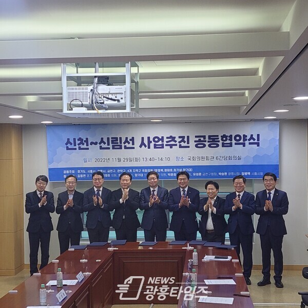 경기도는 29일 국회 의원회관에서 시흥시, 광명시, 금천구, 관악구 4개 지자체, 지역 국회의원 4명과 이 같은 내용을 골자로 한 ‘신천-신림선 광역철도 사업 공동 협약’을 체결했다.