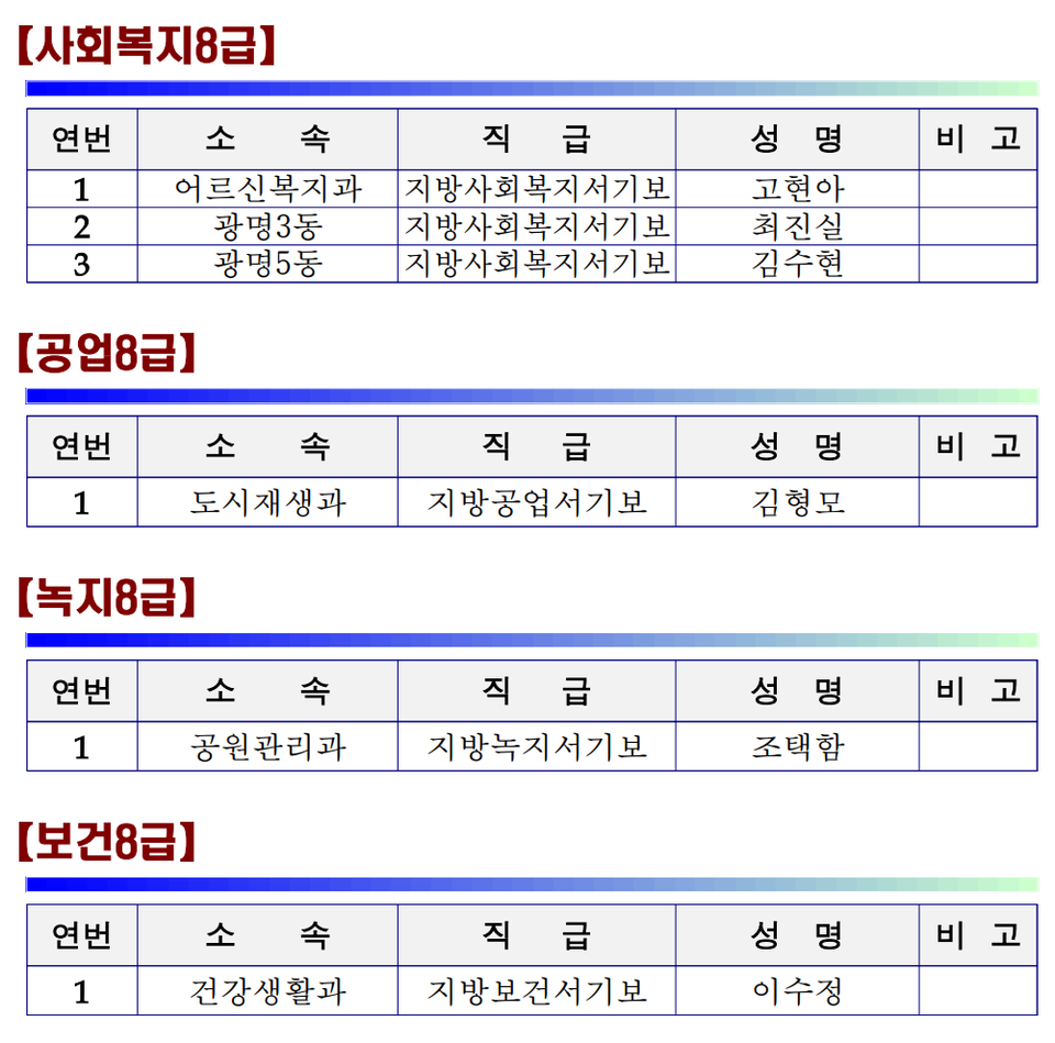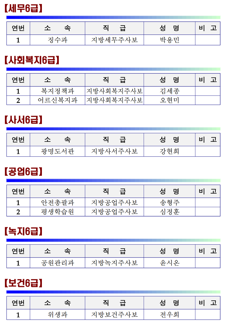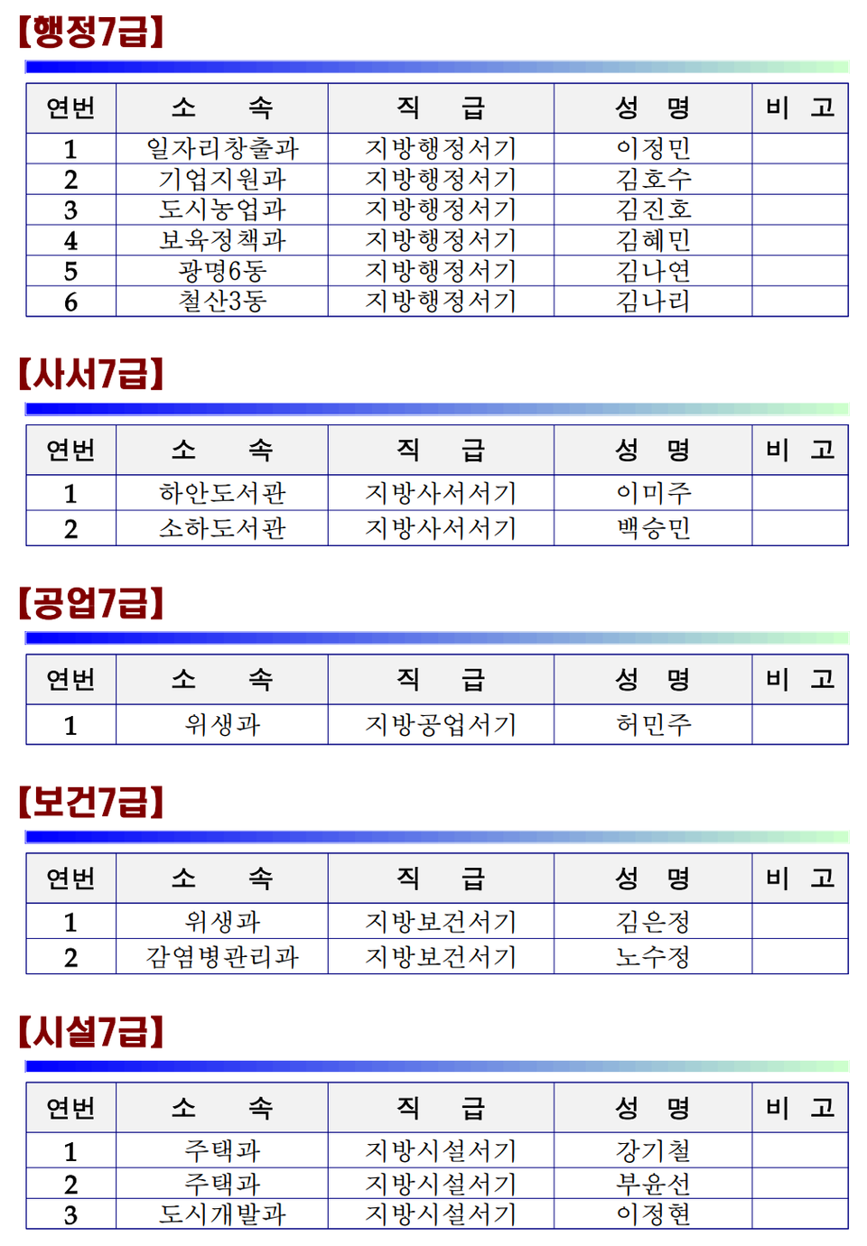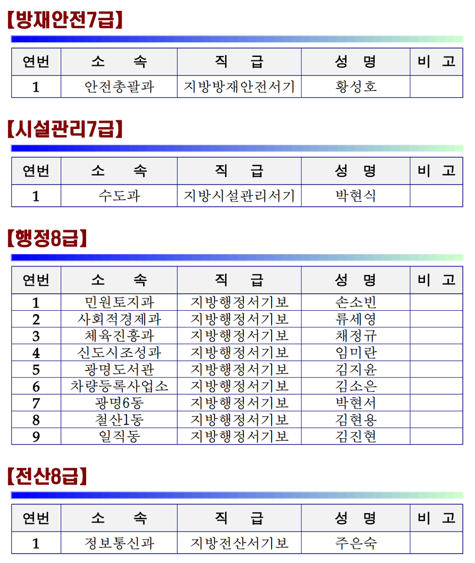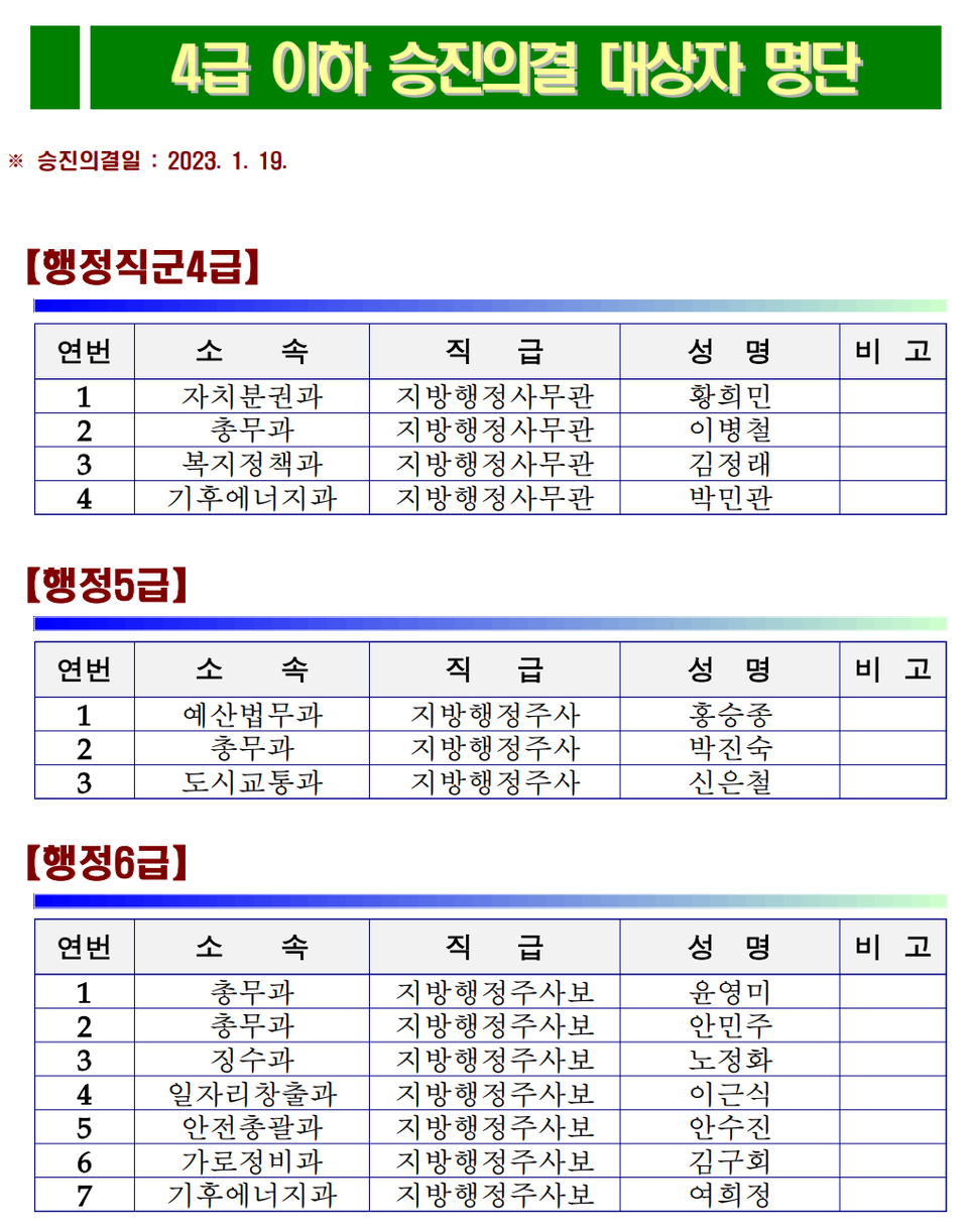 [광흥타임즈] 광명시는 19일자로 4급 국장급(지방행정서기관)에 ▲ 자치분권과 황희민 ▲ 총무과 이병철 ▲ 복지정책과 김정래 ▲ 기후에너지과 박민관 과장을 승진의결했다. 또한 5급 과장급(지방행정사무관)에 ▲ 예산법무과 홍승종 ▲ 총무과 박진숙 ▲ 도시교통과 신은철 팀장을 승진의결했다.
