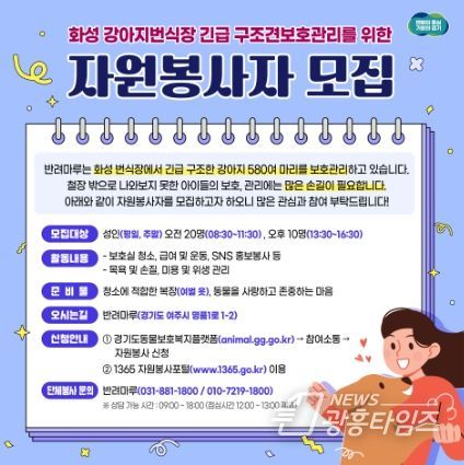 [광흥타임즈 조수제 기자] 경기도가 화성시의 한 강아지 번식장에서 동물보호단체와 함께 구출한 강아지 일부를 도의 반려동물 복합문화공간인 ‘반려마루’에서 보호하고 있는 가운데 강아지들을 함께 보호할 자원봉사자 모집에 나섰다.