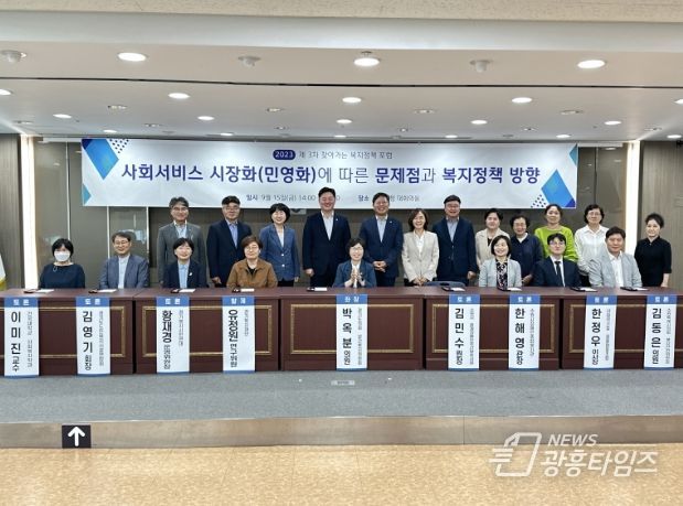 [광흥타임즈 = 조수제 기자] 박옥분 경기도의원(보건복지위원회, 더불어민주당, 수원2)은 15일 수원특례시 장안구청 대회의실에서 ‘사회서비스 시장화(민영화)에 따른 문제점과 복지정책 방향’이라는 주제로 포럼을 개최하여 좌장을 맡아 정책 대안 마련을 모색했다.