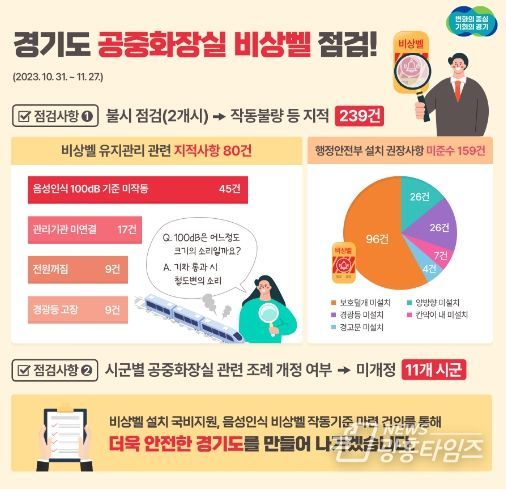 경기도는 지난해 10월 31일부터 11월 27일까지 도내 31개 시군을 대상으로 공중화장실 비상벨 관련 설치 조례 개정과 유지관리 실태 점검을 실시한 결과 239건의 부적합 사례를 적발했다고 11일 밝혔다.