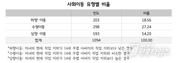 이와 함께 현재 직업과 응답자가 14세 무렵 아버지의 직업을 비교해 부모 세대보다 직업 지위가 높아졌는지를 살펴본 결과에 따르면 응답자의 54.2%는 사회 상승이동을 경험한 것으로 나타났다. 이는 일하고 있는 30~40대 경기도민의 절반 이상은 부모보다 더 나은 직업 지위를 성취했음을 의미한다.