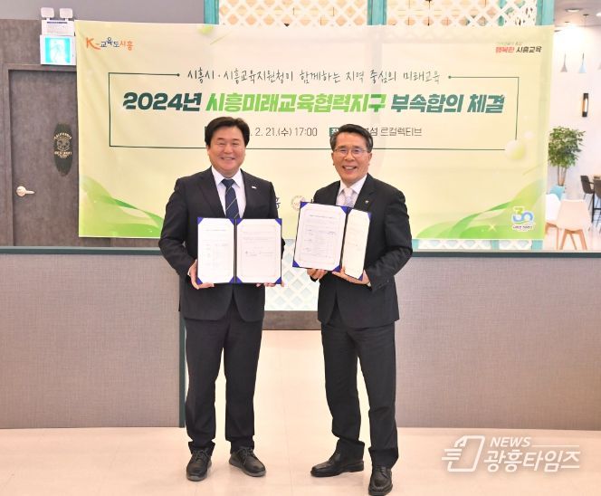 [광흥타임즈 = 조수제 기자] 시흥시와 시흥교육지원청이 지난 21일 시흥 거북섬 르컬렉티브에서 ‘2024년 시흥미래교육협력지구’ 사업 추진을 위해 부속 합의를 체결했다.