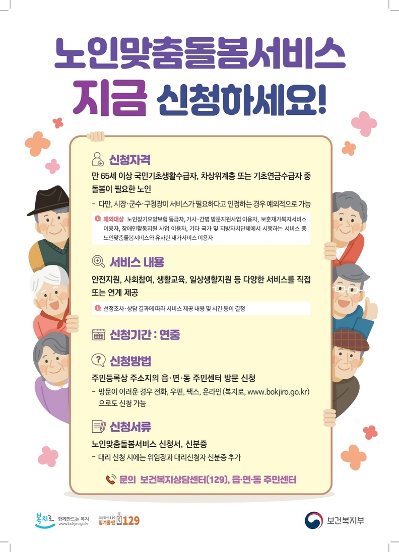 신청 대상자는 만 65세 이상 국민기초생활수급자, 차상위계층 또는 기초연금수급자 중 돌봄이 필요한 노인이다.