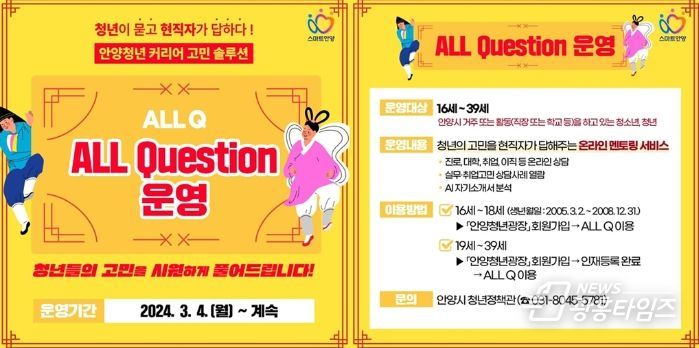 [광흥타임즈 = 조수제 기자] 안양시는 청년들의 진로, 대학, 경력 등 다양한 고민을 해결하는 데 도움을 주는 온라인 플랫폼 ‘올큐(ALL Question)’를 구축하고 4일 서비스를 시작한다.