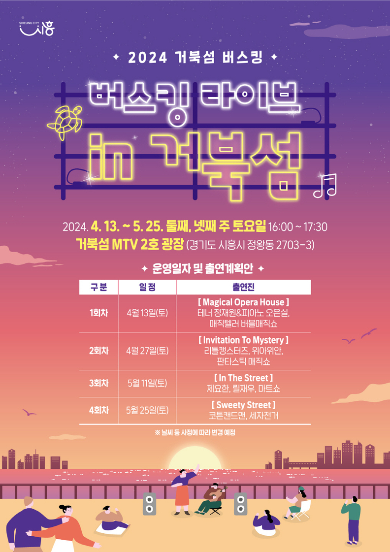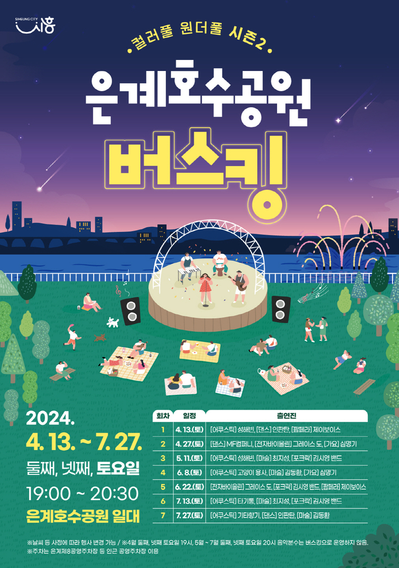 올해는 4월 13일 시작했다. 은계호수공원에서는 둘째, 넷째 주 토요일 저녁 19시에 '컬러풀 원더풀 시즌2'가, 거북섬에서는 둘째, 넷째 주 토요일 오후 4시에 '버스킹 라이브 인 거북섬' 공연이 진행된다. 시흥시는 이 두 곳 이외에도 버스킹을 확대 추진하며 시민들의 더 풍요로운 일상을 응원할 계획이다.