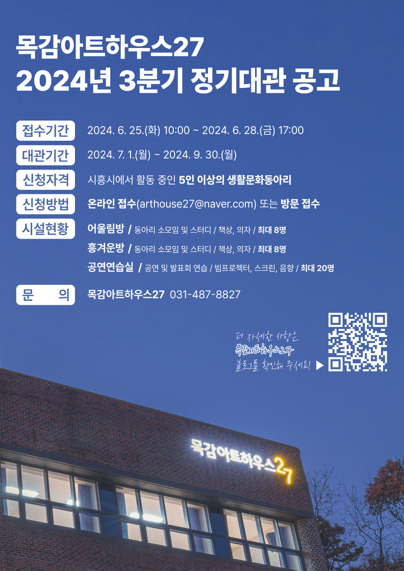 심의를 거쳐 선정된 단체는 7월 1부터 9월 30일까지 총 3개월간 목감아트하우스27 공간을 이용할 수 있다.