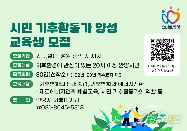 [광흥타임즈 = 조수제 기자] 안양시가 탄소중립 실현을 이끌어 갈‘시민 기후활동가’를 양성하고자 전문 교육(양성교육)을 추진하고 참여자 30명을 선착순으로 모집 중이라고 2일 밝혔다.