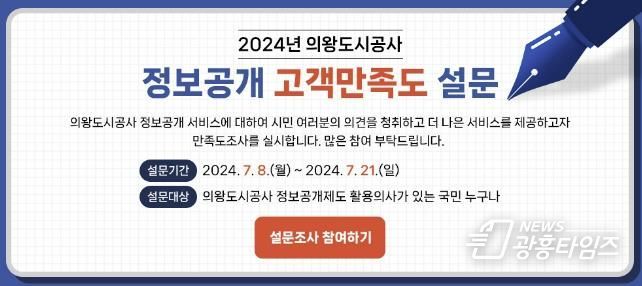 [광흥타임즈 = 구민지 기자] 의왕도시공사는 투명한 행정 운영을 위해 2023년에 이어 올해도 ‘정보공개 고객만족도 설문조사'를 실시한다고 10일 밝혔다.