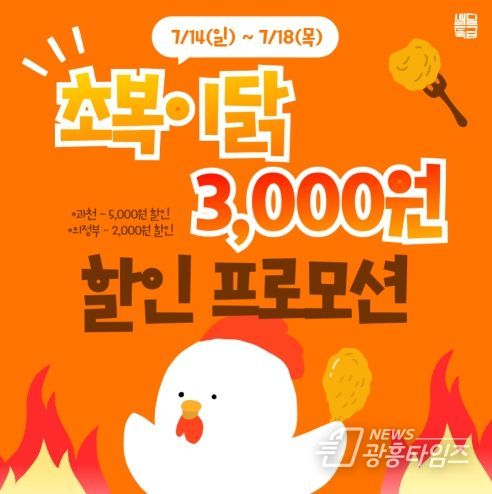 먼저, 오는 18일까지 ‘초복이닭!’ 소비자 할인 이벤트를 진행한다. 이번 이벤트 대상 지역은 가평군, 연천군, 포천시, 화성시, 과천시, 안산시, 안성시, 의정부시, 동두천시, 광명시, 광주시, 구리시, 부천시 등 총 13개 지역이다. 대상 지역 소비자에게는 1만 5천 원 이상 주문 시 사용 가능한 3천 원 할인 혜택을 제공한다.