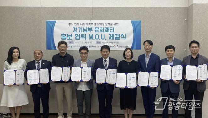 [광흥타임즈 = 조수제 기자] 안양문화예술재단은 김포, 군포, 과천, 광명, 안산, 수원, 오산, 이천문화재단과 함께 지역 문화재단 홍보 협력 강화를 위한 업무협약식을 23일 예술가의 집(서울시 종로구 소재)에서 체결했다고 24일 밝혔다.
