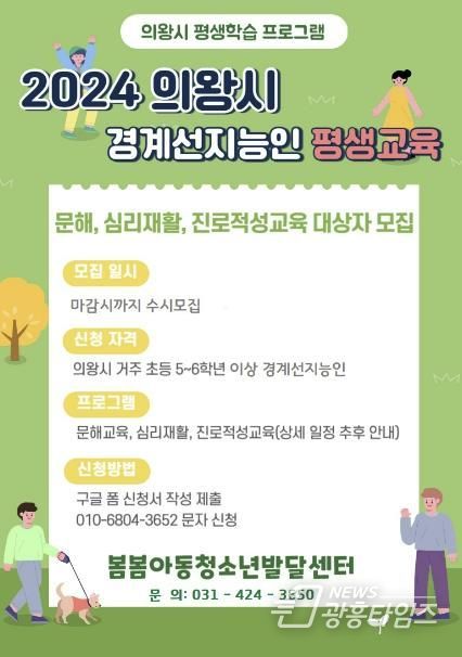 [광흥타임즈 = 구민지 기자] 의왕시는 장애인과 비장애인 사이의 복지 사각지대에 있는 시민을 위한 ‘2024년 의왕시 경계선 지능인 평생교육 프로그램’을 운영 중이라고 밝혔다.