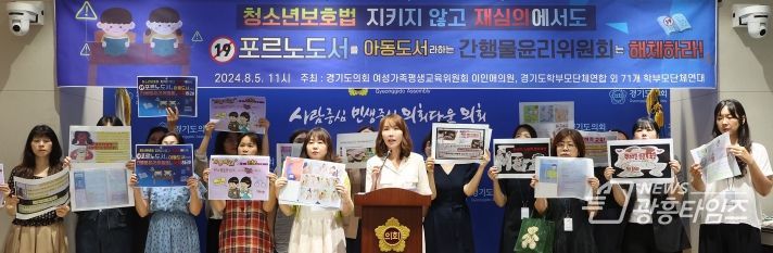 [광흥타임즈 = 조수제 기자] 경기도의회 이인애 의원(여성가족평생교육위원회, 국민의힘, 고양2)은 5일 경기도의회 기자회견실에서 경기도학부모단체연합과 전국 17개 지역 71개 학부모 단체와 함께 '부적절 성교육 도서에 대한 간행물윤리위원회 심의 결과'에 대해 지난 3월에 이어 2차 규탄 기자회견을 개최했다.
