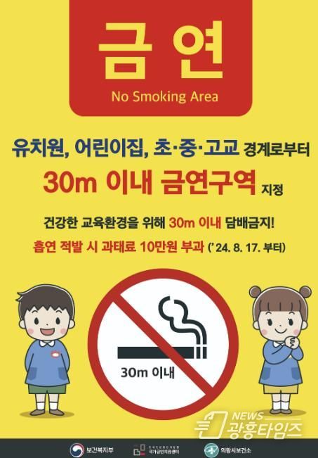 [광흥타임즈 = 구민지 기자] 의왕시보건소는 국민건강증진법 제9조 제6항 개정으로 8월 17일부터 교육시설 경계선으로부터 30m이내로 금연구역이 확대된다고 밝혔다.