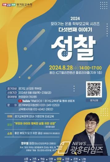 [광흥타임즈 = 조수제 기자] 경기도교육청이 오는 28일 ‘성찰’을 주제로 ‘찾아가는 온품 학부모교육’(이하 학부모교육) 5차 특강을 용인 ICT밸리컨벤션에서 진행한다.
