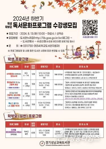 수강생 신청은 8월 13일부터 경기성남교육도서관 누리집에서 선착순으로 모집한다. 학생 프로그램은 학년별 독서체험 대면 강좌로, 학부모 프로그램은 온라인 줌(ZOOM) 강좌로 진행된다.