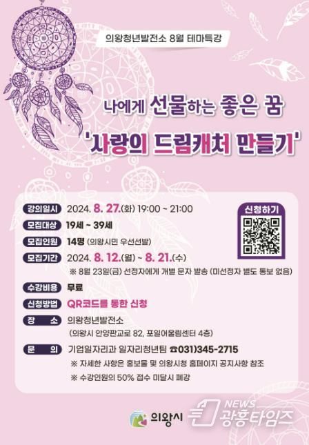 [광흥타임즈 = 구민지 기자] 의왕청년발전소에서 8월 테마특강 ‘사랑의 드림캐처 만들기’ 수강생을 모집한다.