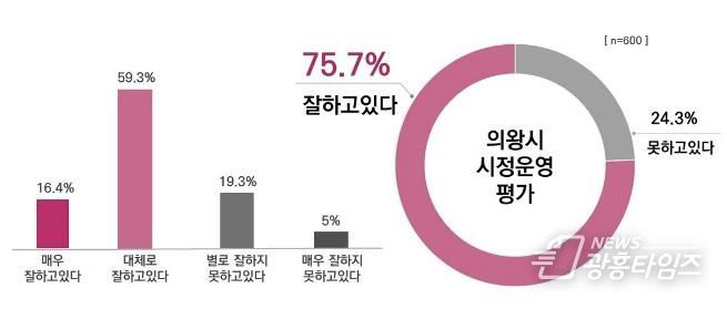 [광흥타임즈 = 구민지 기자] 의왕시민 10명 중 7명 이상(75.7%)이 민선8기 의왕시 시정운영을 긍정적으로 평가하는 것으로 나타났다.