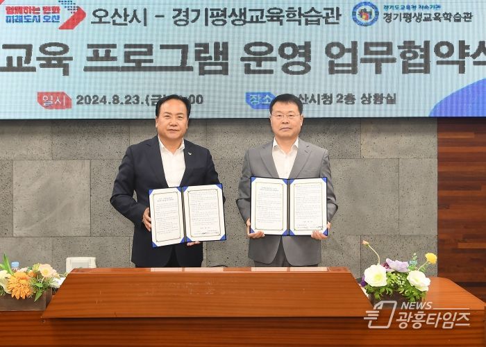 [광흥타임즈 = 조수제 기자] 오산시는 경기평생교육학습관과 23일 오산시청에서 이권재 오산시장, 조정수 경기평생교육학습관장 등이 참석해 업무협약을 체결해 평생교육 활성화에 협력하기로 했다.